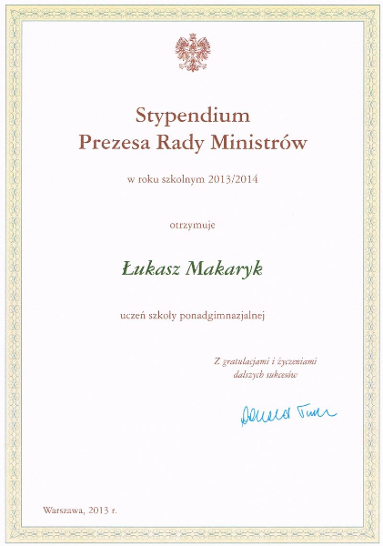Jak co roku Prezes Rady Ministrów przyznał uczniom, którzy uzyskali najwyższą średnią ocen w szkole wyjątkowe stypendia. W roku szkolnym 2013/2014 zaszczyt ten przypadł także Łukaszowi Makarykowi, uczniowi III klasy LO Zespołu Szkół im. Bohaterów Oflagu IID w Bornem Sulinowie.