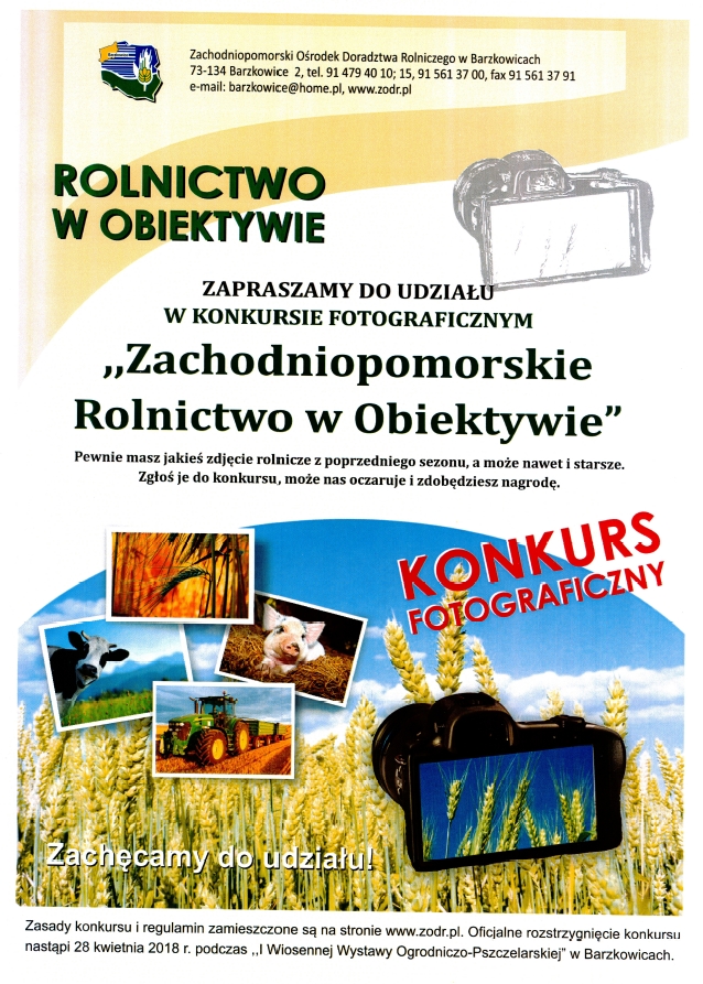 Konkurs fotograficzny ROLNICTWO W OBIEKTYWIE 22 marca 201825 października 2019 Tadeusz Zachodniopomorski Ośrodek Doradztwa Rolniczego w Barzkowicach zaprasza do udział w konkursie fotograficznym „Zachodniopomorskie Rolnictwo w Obiektywie”. Ochrona środowiska