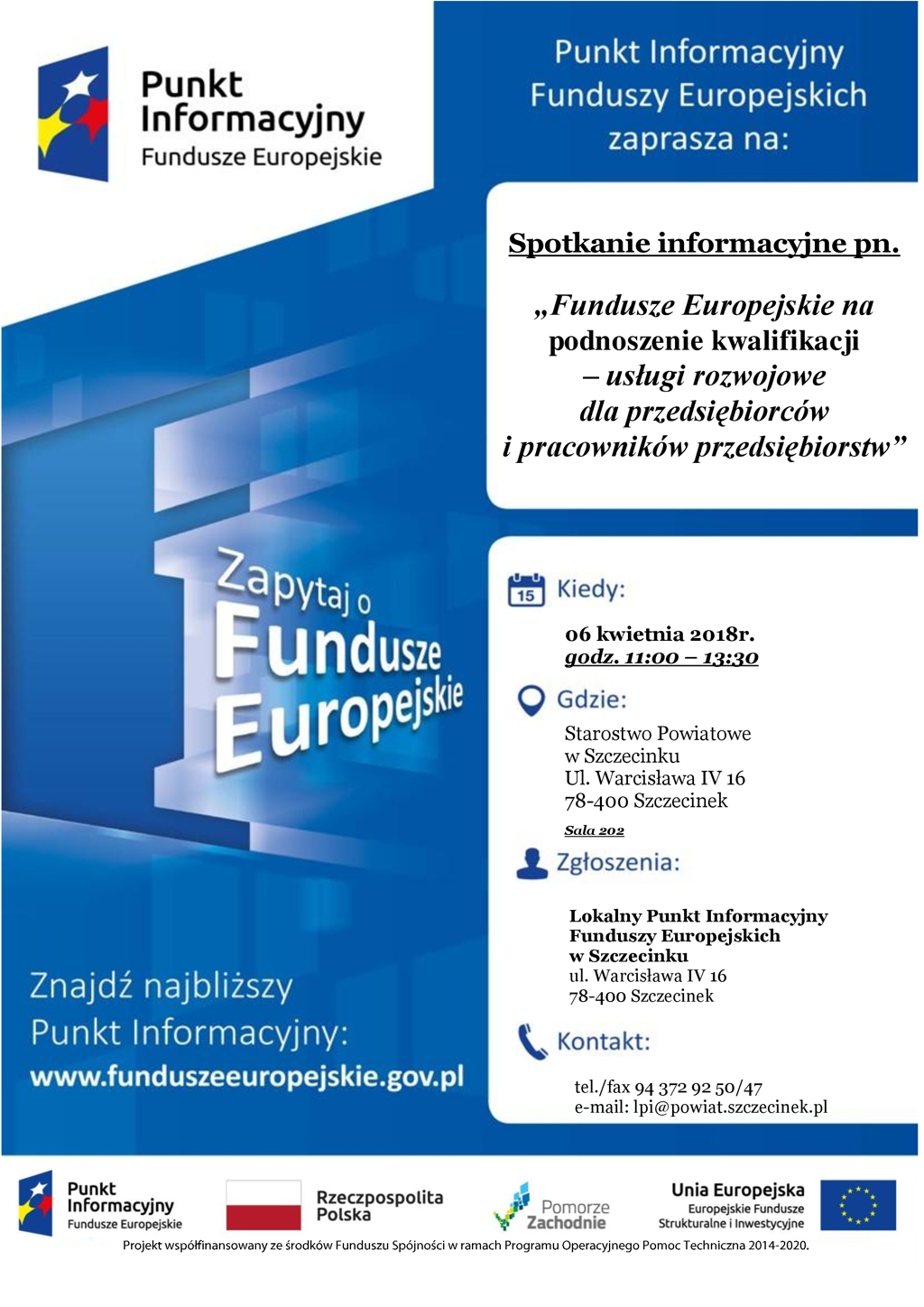 Lokalny Punkt Informacyjny Funduszy Europejskich w Szczecinku we współpracy z Polską Fundacją Przedsiębiorczości serdecznie zaprasza na spotkanie informacyjne pn.: „Fundusze Europejskie na podnoszenie kwalifikacji – usługi rozwojowe dla przedsiębiorców i pracowników przedsiębiorstw”, które odbędzie się 06 kwietnia br. o godz. 11:00,