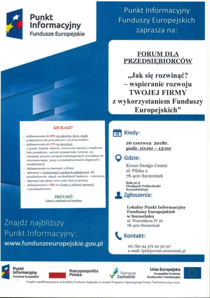 Lokalny Punkt Informacyjny Funduszy Europejskich w Szczecinku serdecznie zaprasza wszystkich Przedsiębiorców na szkolenie pn.: „FORUM dla Przedsiębiorców „ Jak się rozwinąć? – wspieranie rozwoju TWOJEJ FIRMY z wykorzystaniem Funduszy Europejskich”, które odbędzie się 26 czerwca br. w godz. 10:00 – 15:00, w Krono Design Center, ul. Pilska 2, Szczecinek, sala nr 6 (budynek Politechniki Koszalińskiej).