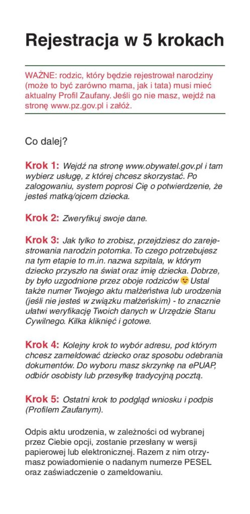 WAŻNE: rodzic, który będzie rejestrował narodziny (może to być zarówno mama, jak i tata) musi mieć aktualny Profil Zaufany. Jeśli go nie masz, sprawdź jak to zmienić.