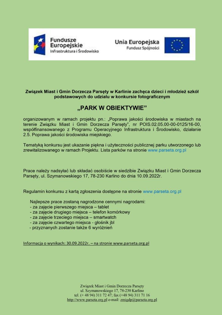 Związek Miast i Gmin Dorzecza Parsęty w Karlinie zachęca dzieci i młodzież w wieku od 7 do 14 lat do udziału w konkursie fotograficznym „PARK W OBIEKTYWIE” organizowanym w ramach projektu pn.: „Poprawa jakości środowiska w miastach na terenie Związku Miast i Gmin Dorzecza Parsęty”, nr POIS.02.05.00-00-0125/16-00, współfinansowanego z Programu Operacyjnego Infrastruktura i Środowisko, działanie 2.5. Poprawa jakości środowiska miejskiego.