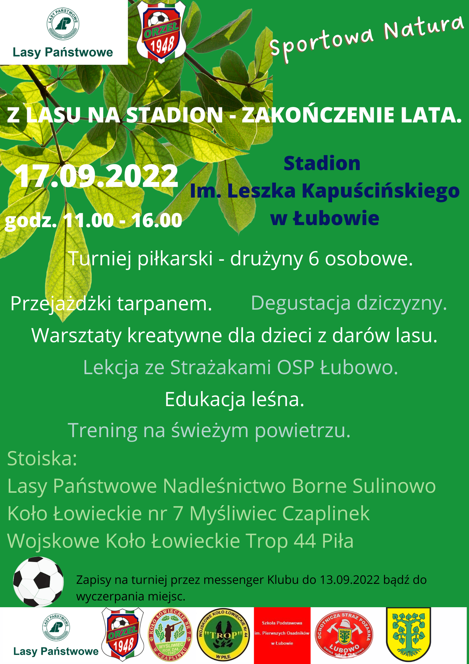 A już wkrótce, bo 17 września, w ramach programu, odbędzie się festyn pn. „Z LASU NA STADION – zakończenie lata”. Poprzez realizację konkursu Lasy Państwowe zachęcają do aktywności fizycznej i ruchu na świeżym powietrzu, w otoczeniu polskiej przyrody. Serdecznie zapraszamy dzieci i dorosłych do udziału w festynie i zapisów na Amatorski Turniej Piłkarski.